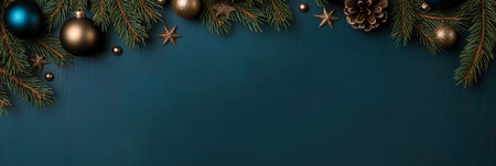 Christmas Banner Mockup with Fir Branches, Blue Ornaments, and Golden Stars on Teal Background