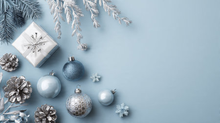 A festive arrangement of snowflakes and ornaments set against a light blue background evoking a winter holiday atmosphere