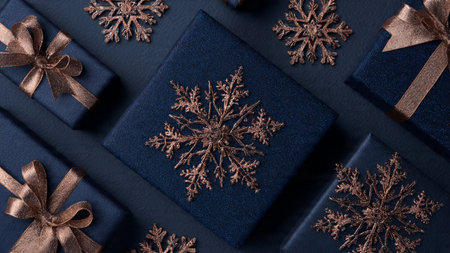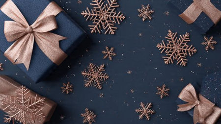 Blue monochrome design featuring smooth gift boxes contrasted by shiny silver ribbons and ornaments.