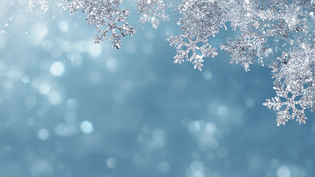 A serene winter scene featuring delicate snowflakes on a frosted blue background. Ideal for seasonal decoration and evoking a tranquil atmosphere.