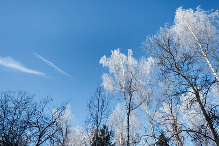 The tops of birches and fir trees on a clear winter day against the blue sky with sun. Copy space background