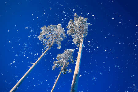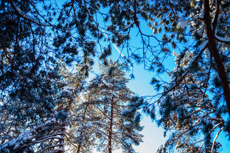 Bottom view of the blue sky and the tops of pine trees in the snow. winter view.