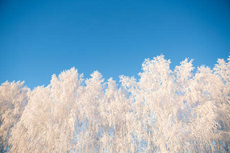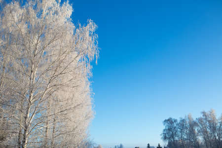 Winter background for design. White branches in hoarfrost and trees against a blue sky