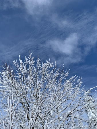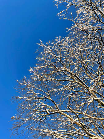 Snowy ice on tree in winter wonderland with blue sky. Beautiful white snow covering the branches of an old tree at a cold winter day