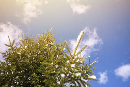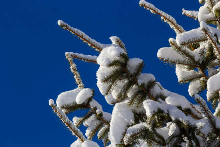 Snow-covered fir branches against the blue sky close up Illuminated by bright sunshine