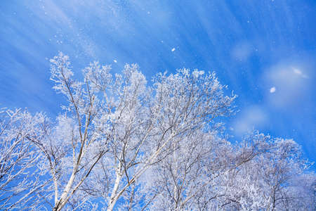Winter Photo of Blue Sky Surrounded by the Treetops. Hoarfrost Falling From the Branches