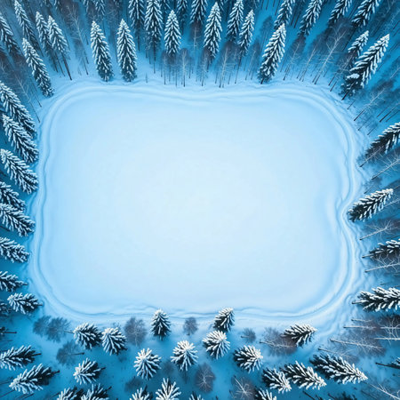 top view winter-themed scene with, featuring a snow-covered woodland. Generative AI