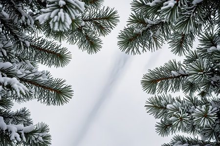 Beautiful winter scene featuring circular frame of evergreen branches covered fresh snow, creating serene and peaceful atmosphere. soft white snow contrasts with rich green foliage, inviting sense