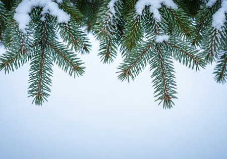 Frosted pine branches frame serene winter background, creating peaceful and festive atmosphere perfect for holiday themes and seasonal decorations