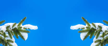 Snow covered fir tree branches on blue clear sky background outdoors. Symmetrical nature banner.