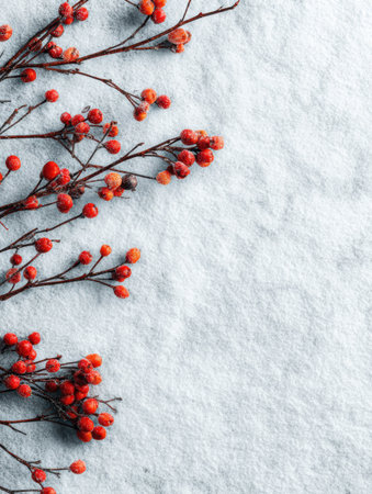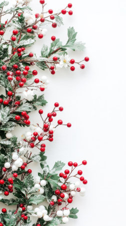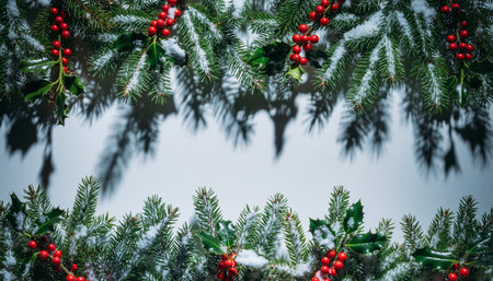 Cinematic high contrast composition featuring snow-dusted pine boughs and bright red holly berries forming natural frame. Perfect for holiday marketing, Christmas campaigns, winter themes.