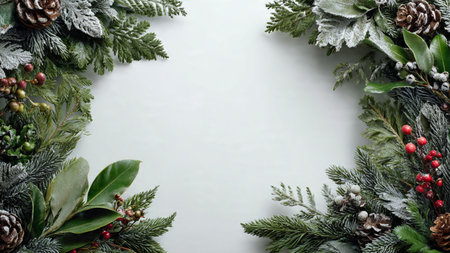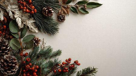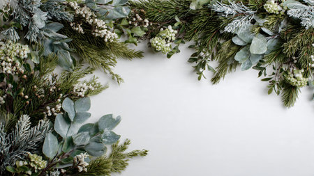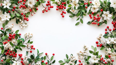 Aesthetic Christmas frame with green branches, red and white berries and flowers, copy space. Generative AI.