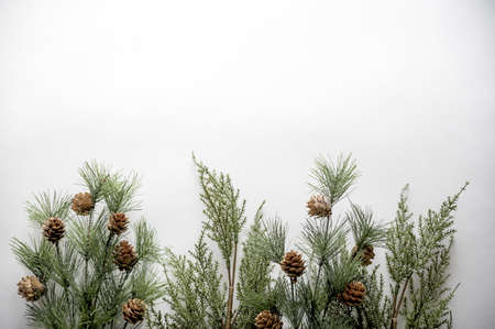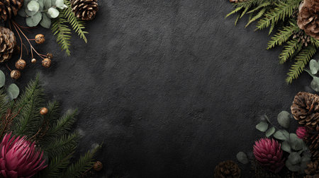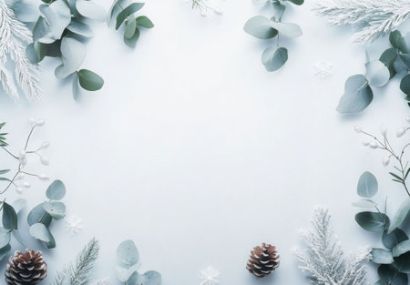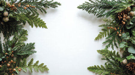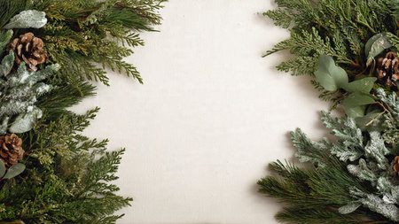 Winter holidays botanical background with blank space for a Christmas greeting text, view from above