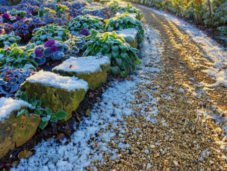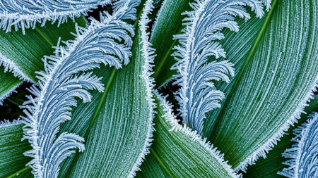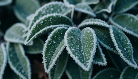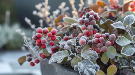 Serene winter garden scene with vibrant red berries and green leaves delicately edged with morning frost in soft daylight