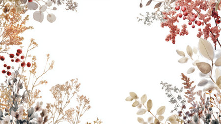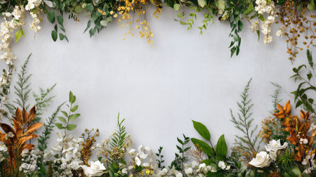 Beautiful floral border design featuring a variety of leaves and flowers, perfect for creating elegant invitations or graphic overlays. The soft backdrop enhances any text.