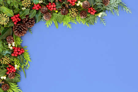 Background border with winter greenery of cedar cypress, juniper fir, mistletoe, ivy & pine cones on blue background. Floral composition for the Xmas & New Year. Flat lay, top view.