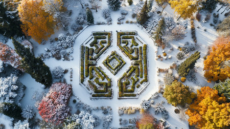 Elegant winter layout with symmetrical pine clusters and golden Christmas decorations.