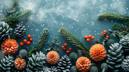 winter foliage, pine cones, snowy background, seasonal decor, holiday theme