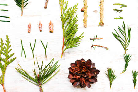 Pattern of tree branches, cones,pine, fir. In a number of conifers. Top view, flat