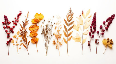 Autumn composition. Dried leaves, flowers, rowan berries on white background. Flat lay, top view. Generative AI.