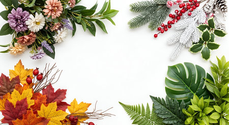 A white background is framed by a diverse arrangement of foliage and flowers, suggesting different seasons. The top left features a cluster of soft-colored flowers and green leaves. The top right displays a sprig of pine with red berries and frosted branches. The bottom left showcases vibrant red, orange, and yellow autumn leaves. The bottom right is filled with lush green tropical leaves and ferns.