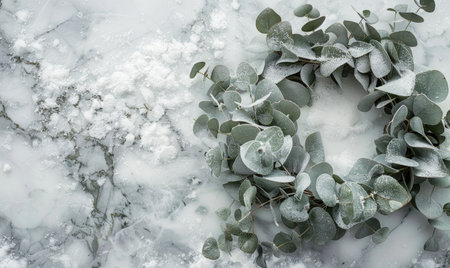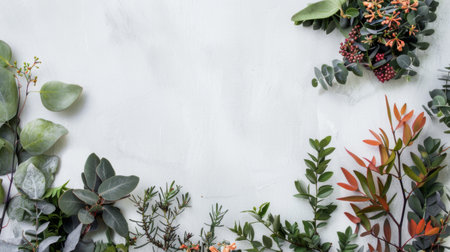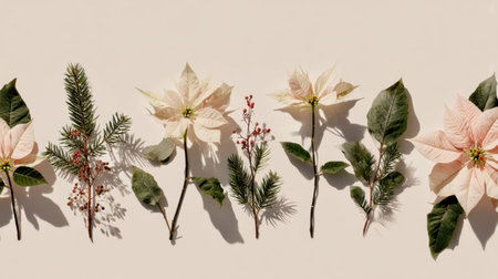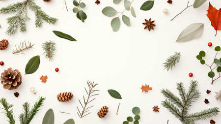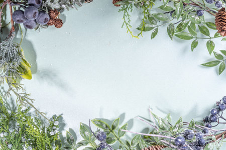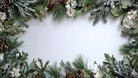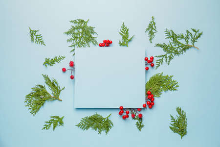 Winter holidays botanical background with blank space for a Christmas greeting text, view from above