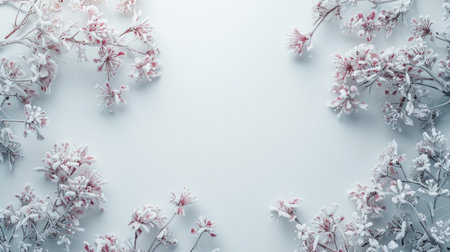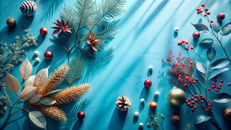 A visually appealing arrangement featuring pastel flowers and Christmas ornaments set on a light blue background, perfect for seasonal celebrations and holiday themes.