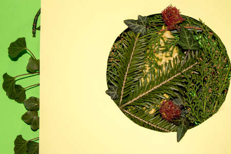 circle of evergreen and other leaves on a pastel yellow background and on the other side of the paper pastel green background with green leaves creative copy space