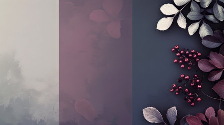 A creative frame composed of metallic leaves in shades of purple and silver, surrounding a central grey copy space.