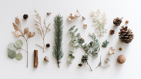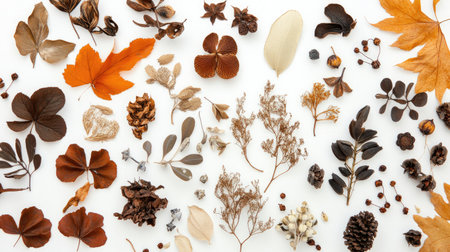 A variety of leaves, pine cones, and other natural elements are scattered across a white surface