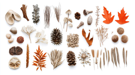 Explore a diverse collection of dried plant materials and seeds, showcasing unique textures and forms against a clean white background for artistic and educational purposes.