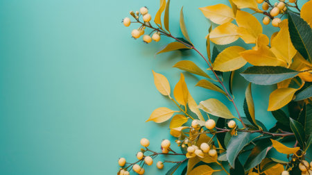 Branch with yellow leaves on a turquoise background. Ideal for nature and seasonal themes.