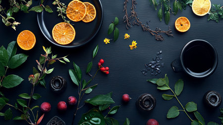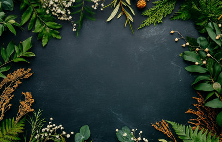 A lush display of various green leaves and delicate flowers surrounds a dark surface, creating a serene and calming atmosphere perfect for design or decoration.
