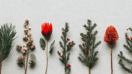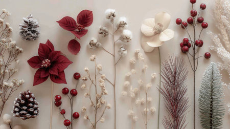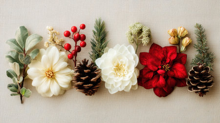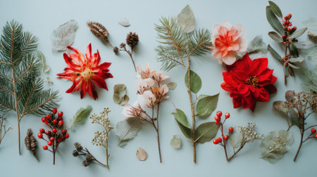A beautifully arranged collection of red flowers, various greens, and pine cones creates a stunning visual on a light background, perfect for seasonal decoration and inspiration.