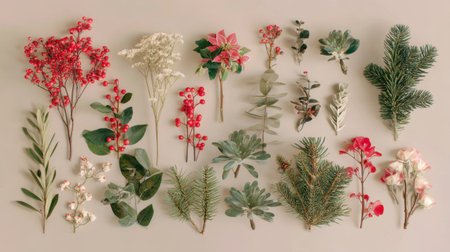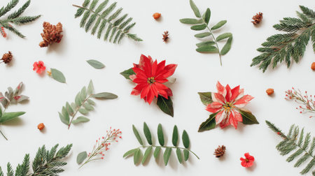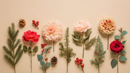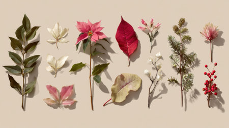 Explore a stunning flat lay display of seasonal flowers and leaves, perfect for holiday decorations or creative projects, featuring vibrant colors and natural textures.