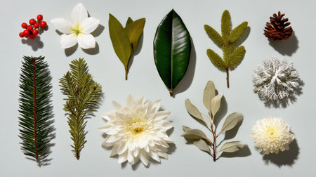 A beautiful flatlay featuring delicate white flowers, lush greenery, blue berries, and pinecones arranged artfully against a clean backdrop, perfect for seasonal decor.