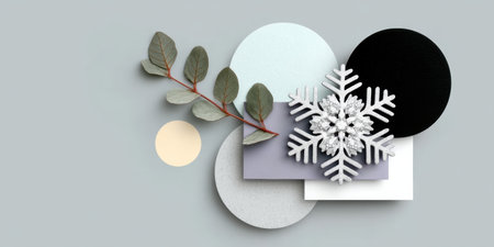 Collage geometric winter composition with eucalyptus branch and decorative snowflake creating calm seasonal still life with muted pastels