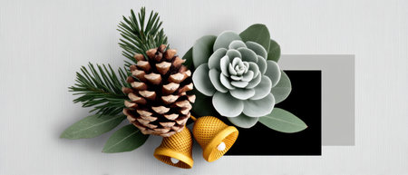 Pine cone, succulent, evergreen branch, golden bells, leaves, modern holiday still life with muted background evoking calm and elegant seasonal