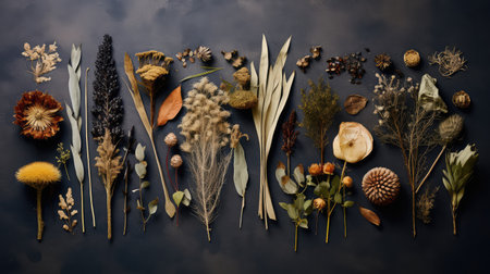 A diverse collection of dried plant materials and seeds arranged aesthetically. Perfect for decor, crafts, and creative projects with natural elements.