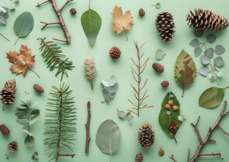 A vibrant assortment of natural elements including leaves, pine cones, and twigs arranged on a soft green background