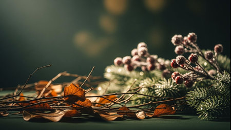 A clean holiday mockup featuring natural pine textures decorated with small metallic details.