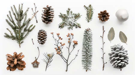 Various pine cones and winter foliage on white background. Concept of nature, winter, Christmas decor, seasonal ornaments.