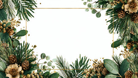 A stylish, minimal Christmas border with thin pine elements and metallic highlights.