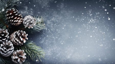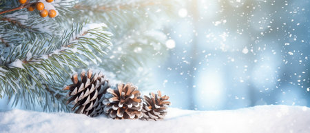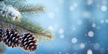 Christmas snowy winter holiday celebration greeting card - Closeup of pine branch with pine cones and snow with blue sky and bokeh lights and snowflakes