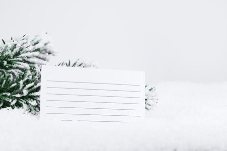 White sheet in a ruler, in the snow, near a Christmas tree branch. Christmas and New Years concept. Copy space