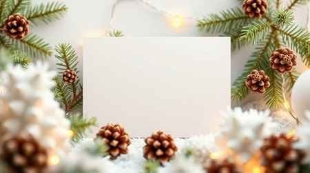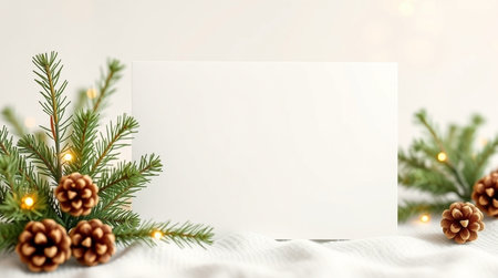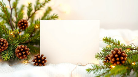 Christmas greeting card mockup with fir tree branches, pine cones and garland lights on white background