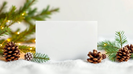 Christmas greeting card mockup with fir branches and pine cones on white background