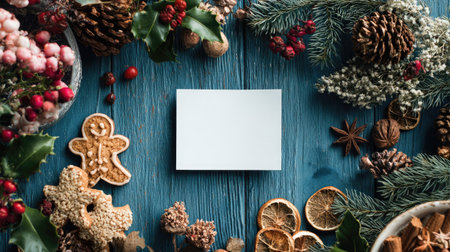 Christmas mockup for postcard with dry fruits, craft paper, gift box, handmade christmas toys
