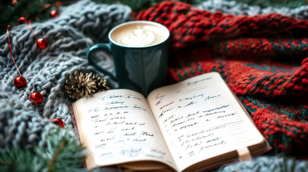 Cup of coffee, notebook and christmas decorations on knitted plaid