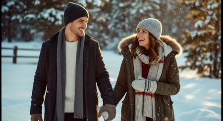 A happy young couple in winter attire smiling amidst a charming snowy landscape